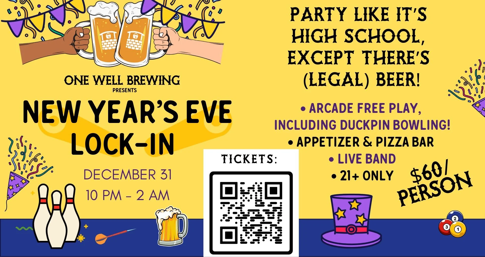 This is a 21+ ticketed event that runs from 10 pm to 2 am! We’ll be closing out 2025 and ringing in 2026 in style, with FREE PLAY across the whole arcade, including duckpin bowling!